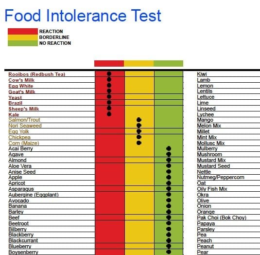 The food triggers that could be causing your symptoms are highlighted using a traffic light system that shows which foods have a reaction (red), borderline reaction (amber), or no reaction (green).