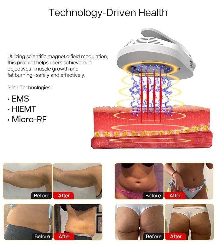 HIFEM technology, the full name is High-Intensity Focused Electro- Magnetic, it induce short bursts of powerful muscle contractions that lead to increased muscle density, decreased volume, better definition, and improved tone. Also the energy will eliminates the fat cells, so not only for muscle building, but also for fat reduction. Clinical research shows that after a course treatment, it can increase 16% muscle and get 19% fat reduction.